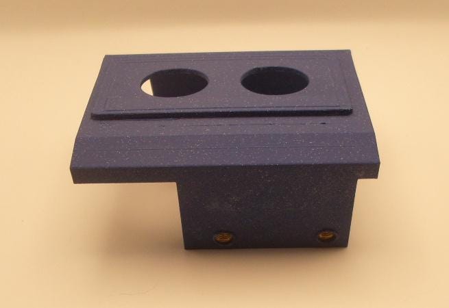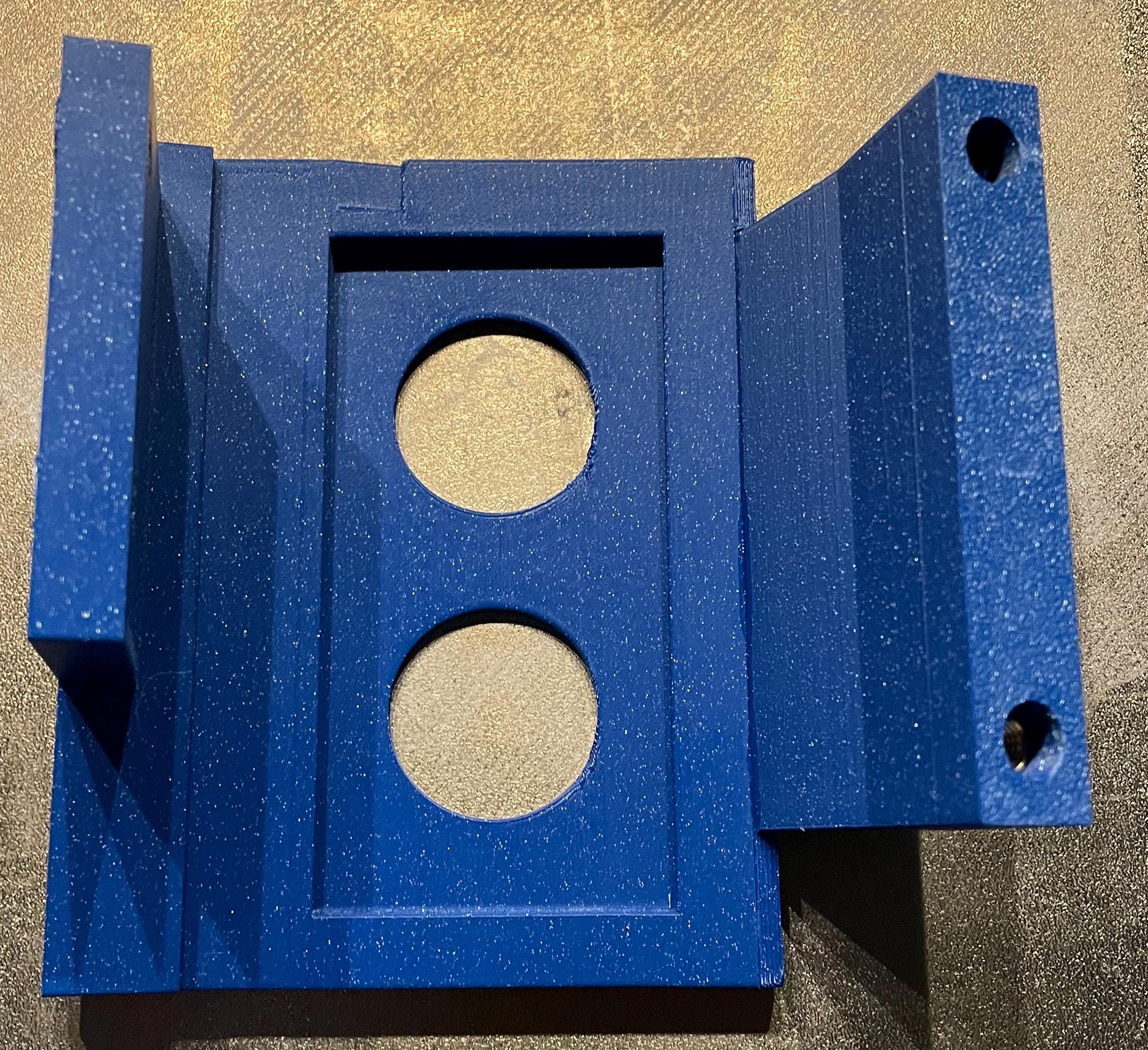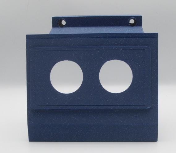 This panel has two round openings that accept most round 12V accessory and USB ports. It fits in the space where the CB Radio is installed in a Honda GL1500 Gold Wing. The panel is held in place by the original CB radio screws. It uses metal threaded inserts embedded in the plastic panel for a secure fit. Made from ASA, similar to ABS but more UV-resistant.